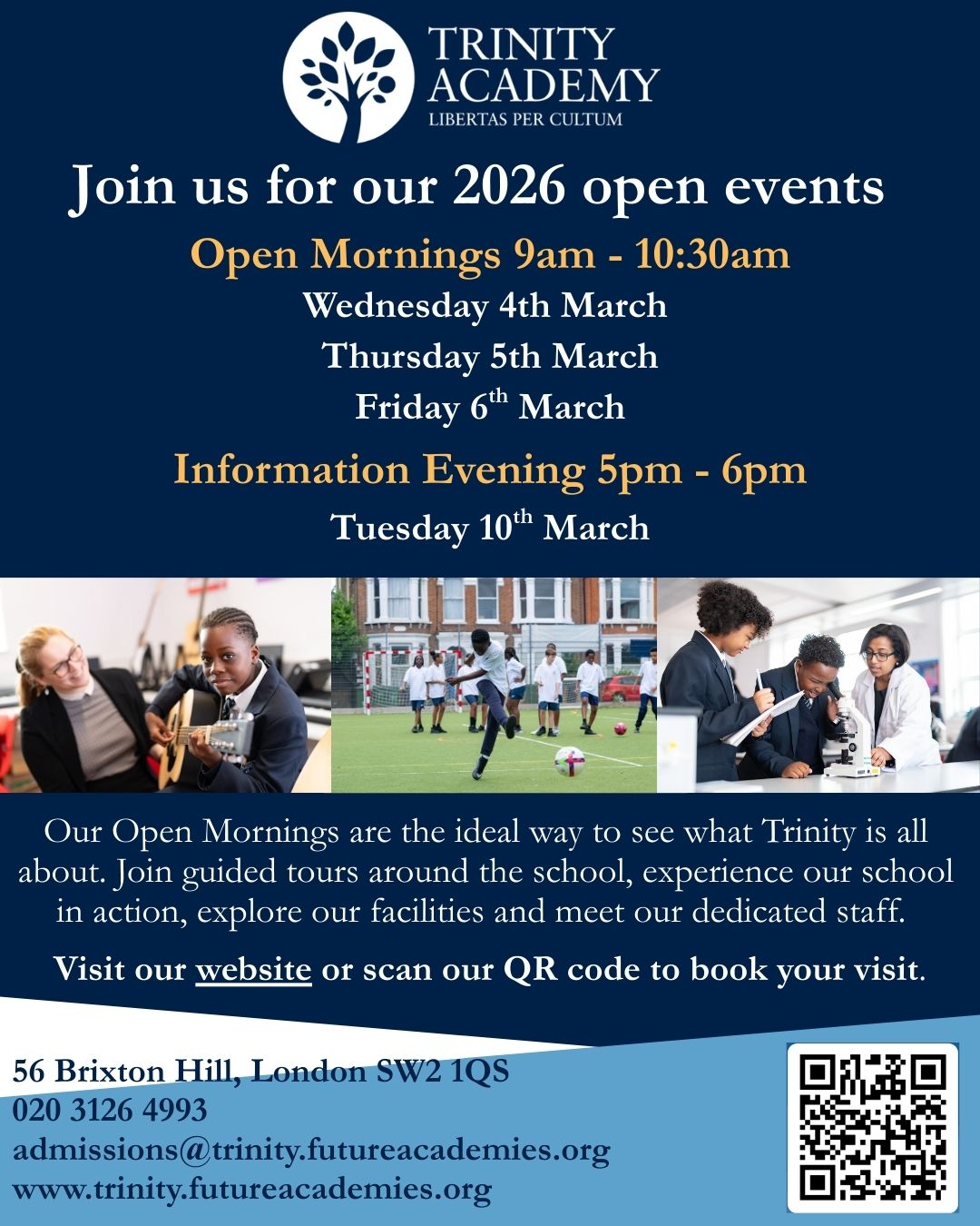 If your child is due to transfer to secondary school in September 2026, please join us at any of our Open Events. This is a great opportunity for you and your child to be able to see the school and all that Trinity Academy has to offer. The event consists of a student-guided tour, where you will have the opportunity to view our school and speak to staff and students about their experiences and life at Trinity.